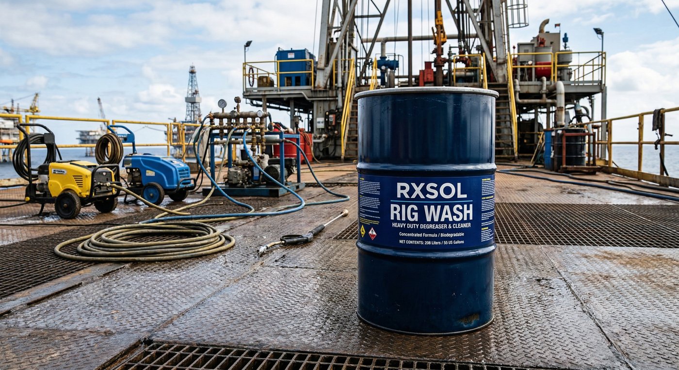 Rig wash is a heavy-duty industrial cleaner used to remove oil, grease, mud, and operational residues from drilling rigs and related equipment.